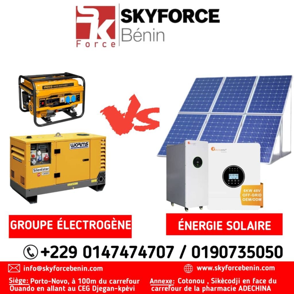 En résumé, le groupe électrogène peut être une solution ponctuelle ou d’urgence, mais l’énergie solaire est une option durable, économique et écologique, parfaitement adaptée aux foyers et entreprises béninoises.